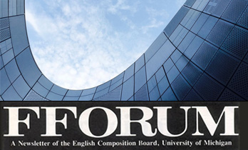 fforum: A Newsletter of the English Composition Board, University of Michigan was published for four years in ten issues beginning in fall 1979. The length of each volume, which eventually ran to more than 100 pages in its last two volumes, bely the standard conception of a newsletter. Contributors to fforum include William E. Coles, Peter Elbow, Toby Fulwiler, Cy Knoblauch, Janice Lauer, Ken Macrorie, Donald Murray, Jay Robinson, Patty Stock, and John Warnock, among many others.