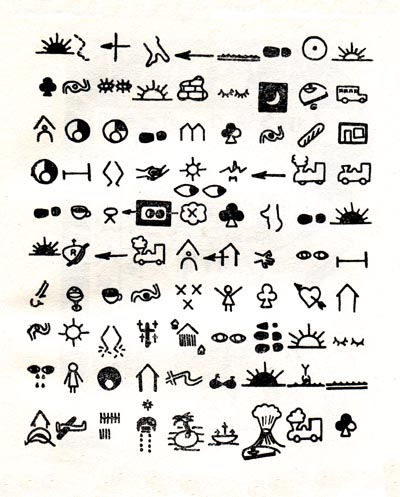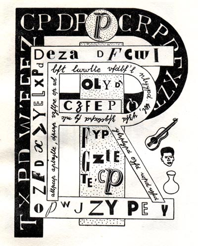 | Plate C, explains Lemaître, describes a trip to Italy (presumably beginning and ending in Paris). Pictures represent actions. So closed eyes signify sleeping, a full glass signifies drinking. It's up to the reader, Lemaître says, to figure out the meaning. What is also up to the reader is to figure out an eyepath. I don't think the left-to-right, top-down movement of conventional Romance-language script will work here. What I take to be the conclusion to the journey is represented by the three pictographs at the bottom left: the vertical slashes tally a journey of ten days, the airplane indicates a flight back to Paris, and the house locates his home in St. Germain-des-Prés (the kidney-shaped schematized map of the Paris district also appears in Plate A, much larger and with landmarks identified). This and other clues suggest that the reader begin at the upper right and read the lines right-to-left, as in Hebrew, Arabic, runes, and other languages. Plate D, Lemaître tells us, is a cryptogram (his only hint is that "c" equals "r"). More interesting is that the basic eye direction proceeds foreground to background (or background to foreground), as in a painting. Together the five plates of Lemaître's roman hypergraphique demonstrate five novel and nonlinear eyepaths for "reading": Plate A, spatial approaching; Plate B, inward spiral; Plate C, right-to-left; Plate D, foreground-background; Plate E, maze. Lemaître's hypergraphic anticipation of hypertext is a little eerie. | |