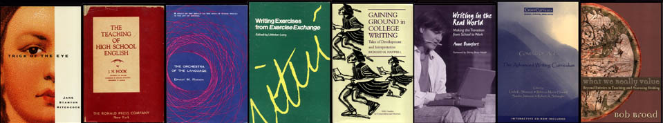 Here is a rogues gallery of book covers, all but one from the field of composition studies. They offer a bit of historical perspective and a bit of disciplinary perspective. The first in line is decidedly out-field. It's Chip Kidd's cover (enlarge) for a suspense novel by Jane Stanton Hitchcock, Trick of the Eye, which Dutton published in 1992. The design serves as Kidd's own example of an artistic technique he calls "repurposing." To repurpose, the book-cover artist begins with a found object and then transforms it so that it is "taken completely out of its previous context." With Hitchcock's cover he worked from a photostat of an image on the top of a box of Jean Valjean Cuban cigars. The trick, however, is cleverly appropriate to the novel, whose setting is the world of high art and whose detective hero is an artist herself, specializing in trompe-l'oeil. Can repurposing, in Kidd's sense, be found in composition-studies book covers? Actually, not much that I've seen. What their history shows is almost the opposite, a kind of fixation on the literal. Instead of imaginative transformations from one human sphere to another, we get enhancements of the prosaic stuff already found in the composition field. Instead of repurposing we get refurbishing. Scan my chronological lineup of covers. The dustcover (enlarge) of J. N. Hook's scholarly The Teaching of High School English (Ronald Press, 1950) consists of nothing but words except for one inconspicuous decorative fleuron, typical of books of its era that wanted to look, well, scholarly. Ernest M. Robson's The Orchestra of the Language (Thomas Yoseloff, 1959) is an early instance of the turn toward pictorial jackets in academic books, but the design (enlarge), though aesthetically appealing, is an imitation of sound wave patterns. The acoustics of English is, in fact, Robson's topic. The cover (enlarge) to Littleton Long's collection of writing exercises from Exercise Exchange (National Council of Teachers of English, 1976) offers just the word "writing," handwritten and enlarged as if a myopic English teacher were getting very close to see if the word isn't misspelled with two t's. I include the dustcover (enlarge) to my own Gaining Ground in College Writing (Southern Methodist University Press, 1991) because it comes with a little inside information about composition-studies attitudes toward academic book covers. The assistant editor sent me a mock-up of the cover, worried because "Our designer got creative" and wondering if I found the design "reasonably relevant to the content of the book." It seems covers shouldn't be too imaginative or too indirect—in other words, shouldn't repurpose. And indeed the cover (enlarge) to Anne Beaufort's Writing in the Real World (Teachers College Press, 1999) is about as unimaginative and direct as you can get. Befitting a study of real-world composing, here is photographic proof in black and white of a person literally writing in the real world (don't ask why she has a pencil in her mouth). Photographs are popular now in composition-studies book covers. The one (enlarge) for Linda Shamoon, Rebecca Howard, Sandra Jamieson, & Roberet Schwegler's Coming of Age: The Advanced Writing Curriculum (Boynton/Cook Heinemann, 2000) provides a telling variant. What does this scape of misty mountains have to do with college writing courses? If there is no connection of the cover with the book's purpose, there can be no repurposing. The design, pleasant enough but purely decorative, would bring us full turn back to the meaningless flourish on the cover of Hook's 1950 book. But perhaps the mountains metaphorically allude to the book's topic of advanced writing or upper-division composition courses? That would lead to my one clear example of repurposed art from the world of composition-studies book covers. For Bob Broad's What We Really Value: Beyond Rubrics in Teaching and Assessing Writing (Utah State University Press, 2003), the designer reproduced Pietro Vesconte's 1321 map of the world known to Europeans (enlarge). I think the choice is creative and evocative. In his book Broad attempts to chart the values that writing teachers actually use when they assess student writing. It turns out Broad's teachers applied around 90 different criteria, not the five or six that testing companies designate in their rubrics for raters. As Pietro did, Broad draws a mappa mundi of a complex and thinly charted territory, where named locations are largely those known to maritime explorers and interiors are still pretty mysterious. The cover takes an image "completely out of its previous context" and aptly repurposes it. Nice. (Especially since it seems the illustrator may have read the manuscript, or some of it.) Chip Kidd, who has been Knopf's chief cover artist for years, sometimes adds a further trick. That is to manipulate his found object so radically that the viewer doesn't recognize what its previous context was, as with the cigar-box image for Hitchcock's novel or Kidd's own passport for his cover to Martin Amis's Visiting Mrs. Nabokov. Part of the aptness to the book remains hidden, a kind of inside joke. Perhaps it is too much to expect composition-studies covers to go that far. The magnetic pull of the literal, the serious, and the prosaic in the profession is too strong. After all, we're scholars of non-fiction prose, aren't we? Notes I've taken the book cover for Trick of the Eye and the quotes from Chip Kidd from his endlessly fascinating Chip Kidd: Work: 1986-2006 (Book I), published by Rizzoli International, 2005. Ernest M. Robson's The Orchestra of the Language deserves a CompPanel of its own. As a chemist, he was an outsider to composition studies, whose self-histories omit him completely. Orchestra is appealingly eccentric. It ends with 35 pages of poetry composed with techniques based on his acoustic analysis of English. Pietro's map is a medieval type historical cartographers call T-O. It is perfectly circular an