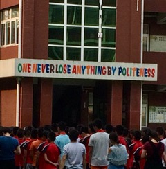 Fig. 3. Photo by author. A group of children and teachers lined up for an assembly in a school courtyard. Above the entrance is a multi-colored slogan that reads, “One never lose anything by politeness.” My students volunteered briefly at this school, leading English learning games with huge classes of children. This particular school prides itself on their English instruction, and their promotional materials feature white international English teachers who also were likely short-term volunteers.
