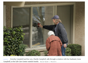 Ryder, David. “Photograph of Dorothy Campbell and her son, Charlie Campbell.” Reuters. 10 Mar. 2020.  https://www.nbcnews.com/news/us-news/nursing-home-s-coronavirus-lockdown-keeps-wife-her-husband-58-n1154246.