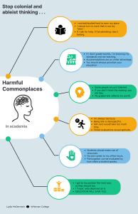 Fig. 5. “Harmful Commonplaces in Academia,” infographic by author, OCR optimized. This infographic presents commonplaces overheard in academia that govern student and faculty perceptions and actions. The commonplaces are some of many and are meant to represent the range of colonial and ableist ideas floating through our workplaces and life-places. There are certainly many more than are listed here.