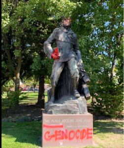 Patia, Kaitlyn. “Photograph of Marcus Whitman Statue Defaced.” Whitman Wire, Friedman, Lena, “Seeing Red: Responses to Symbols of Whitman’s Legacy Sweep across Campus.”15 Oct. 2019. https://whitmanwire.com/news/2019/10/15/seeing-red-whitman-legacy/#.