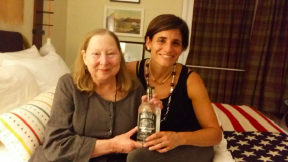 Figure 1: Lisa Ede and Jessica Restaino. Image description: Two women, Lisa Ede (left) and Jessica Restaino (right) are sitting together on a bed. On the bed is a colorful throw pillow and an American flag blanket. The women are smiling and holding in between them a bottle of gin.