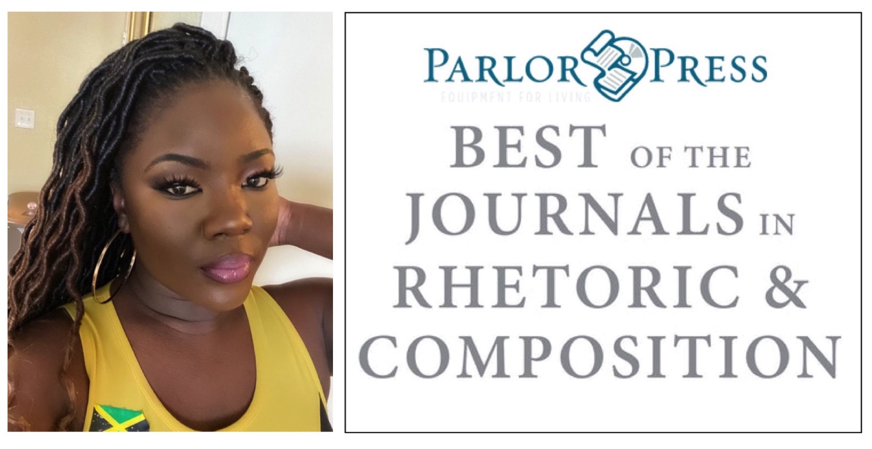 Image Description: on the left, a close-up photo of Efe Franca Plange, whose long hair is behind her shoulders. She is wearing a yellow tank top, hoop earrings, and a sticker or pin of the Jamaican flag. She has a serious expression on her face. On the right is the logo for Parlor Press and the logo for the Best of the Journals in Rhetoric and Composition series.