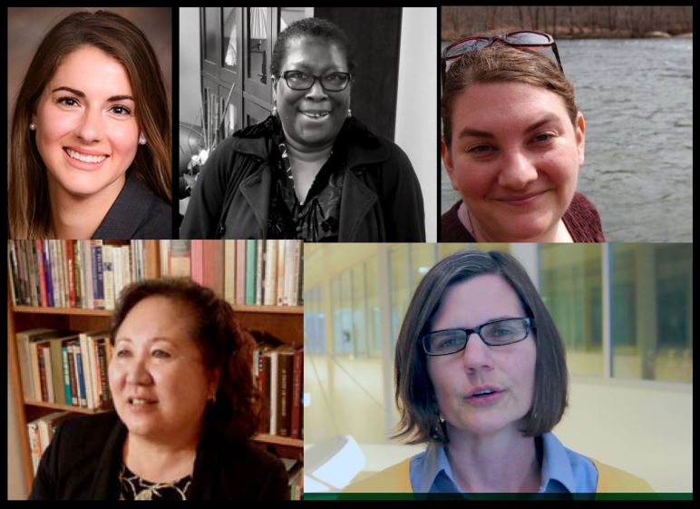 Image description: a collage of headshots against a black background, three on the top row and two on the bottom. Top: Katie McWain against a solid brown background, Joyce Irene Middleton, in a black-and-white photo with a display cabinet in the background, and Genevieve Critel, outdoors with a natural body of water in the background. Bottom: Carolyn Handa, sitting in front of a bookshelf, and Amy Rupiper Taggart in a still from a video interview, in front of a hallway lined with windows.