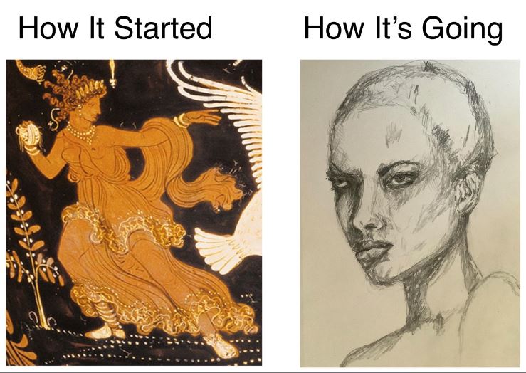 Image Description: On the left, the words “how it started” and, underneath, an image of art representing the goddess Peitho, a full-length portrait of the goddess in a flowing robe, with curly hair wearing a headpiece similar to a crown. She is leaning to the left, as though lunging away from someone outside the frame. On the right, the words “how it’s going” over a sketch of a woman with a shaved head. The sketch shows her head and shoulders. She has a stern expression on her face and is glaring off to the viewer’s left.
