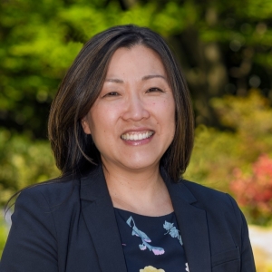 figure 1: a professional headshot of Dr. Hyoejin Yoon. She is smiling and wearing a navy blue blazer and navy blue blouse with flowers. The out-of-focus background is sunlit trees and shrubs.