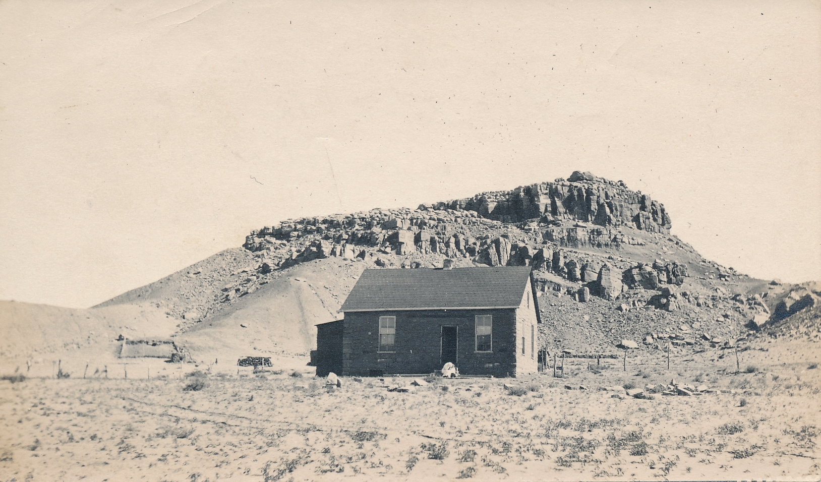 Figure 4: “Looking north view from my front gate. The Drs. house. I made an X on the sheep corral up on the side of the hill. It is quite steep” (Idella Hahn) c. 1913-14. Image description: a small one-story house with a large rock formation behind the house in the background.
