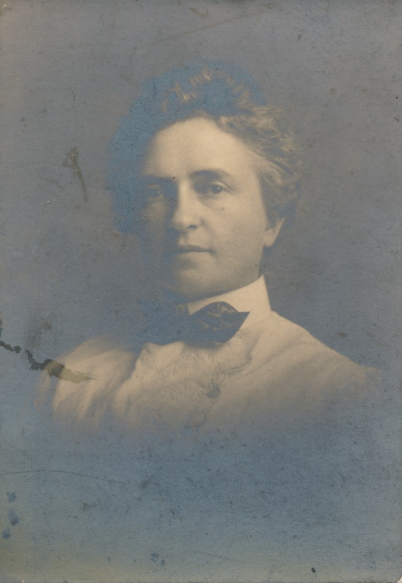 Figure 2: Idella Hahn c. 1913. Image description: a headshot of Idella Hahn, who would have been in her mid-40s. She has short curly hair and is dressed in a white blouse with a dark bow at the throat. She is looking directly into the camera with a serious expression.