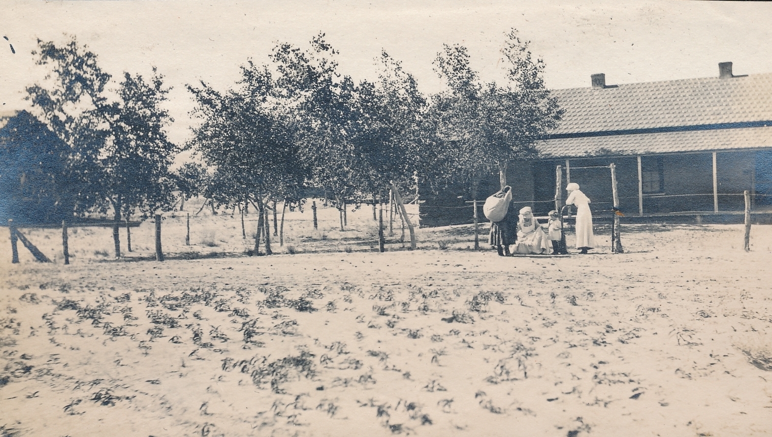 Figure 3: “My house Oraibi” (Idella Hahn) c. 1913-14. Image description: a long, one-story ranch style house seen from far away on flat land with a fence and a line of trees in front. On the left is another structure: another house or a barn. In front of the fence are three adult women and a child.