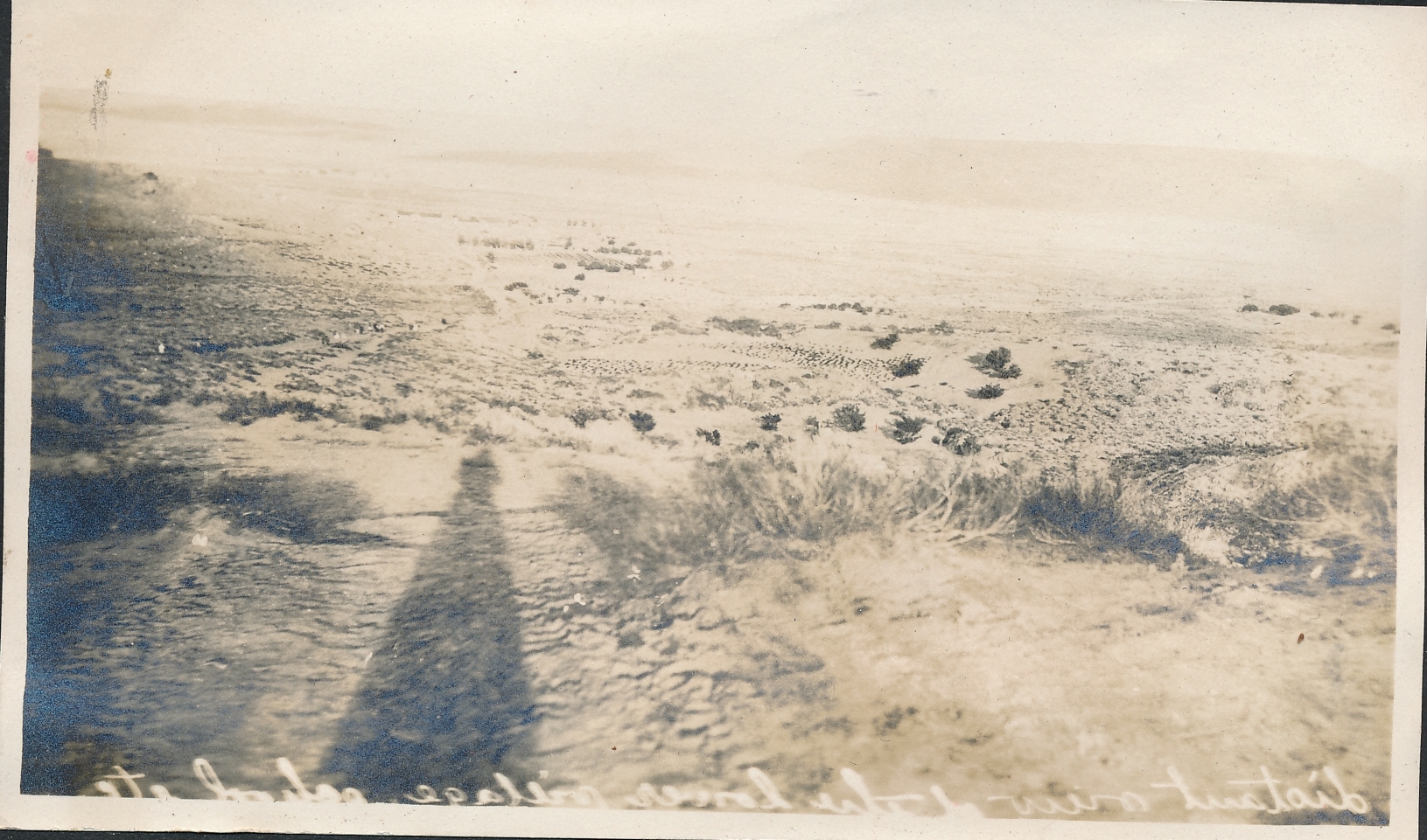 Figure 1: “View of lower village road” (Idella Hahn) with her shadow c. 1913-14. Image description: a wide shot of flat land with short shrubs. In the foreground is a shadow of a woman in a long dress.