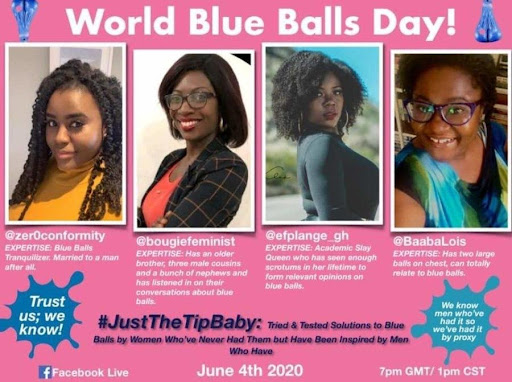 It features four female activists of the PDM Movement (myself included) as panelists of a fake day set aside with fictional profiles to commemorate Blue Balls, a phenomenon associated with the male sexual experience. The strategies employed here include Humor as a form of critique where sarcasm is used as an inventional tool that subverts and upends the very technique used by men in discussing women’s issues. The goal here is to draw attention to the ludicrousness of the thinking that women—by association, by familial ties to men, by observation—know what men’s issues are. Secondly, the counter-flier touches on the knowledge-by-proxy criterion which usually informs the selection of male panelists. As such, expertise here (on blue balls) isn’t by education, credentials, experience, or training of any sort, but by mere association. In addition to this is the intentionality in the coining of the themes that explicitly present the displeasure of these women who do not want to tolerate the idea of men’s dominance on issues not pertinent to them.