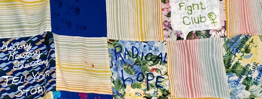 Cover Art: A photo of the CCCC Feminist Caucus wall quilt, sewn by Holly Hassel from fabric squares made by attendees of CCCC 2019. Overlaid in the lower right corner is a yellow square with Peitho Volume 25.3 Spring 2023 typed in a handwriting font.