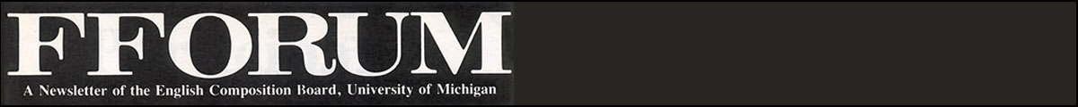 fforum: A Newsletter of the English Composition Board, University of Michigan was published for four years in ten issues beginning in fall 1979. The length of each volume, which eventually ran to more than 100 pages in its last two volumes, bely the standard conception of a newsletter. Contributors to fforum include William E. Coles, Peter Elbow, Toby Fulwiler, Cy Knoblauch, Janice Lauer, Ken Macrorie, Donald Murray, Jay Robinson, Patty Stock, and John Warnock, among many others.