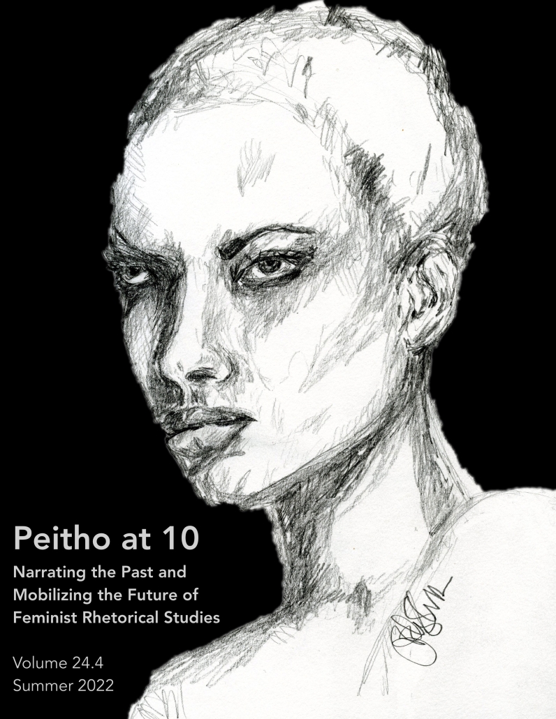 Image description: a drawing by Jody Shipka of a womanÆs head and shoulders, done in pencil, against a black background. The womanÆs hair is very short, and she is looking into the distance with a scornful expression. In the lower left corner are the words ôPeitho at 10: Narrating the Past and Mobilizing the Future of Feminist Rhetorical Studies. Volume 24.4 Summer 2022.