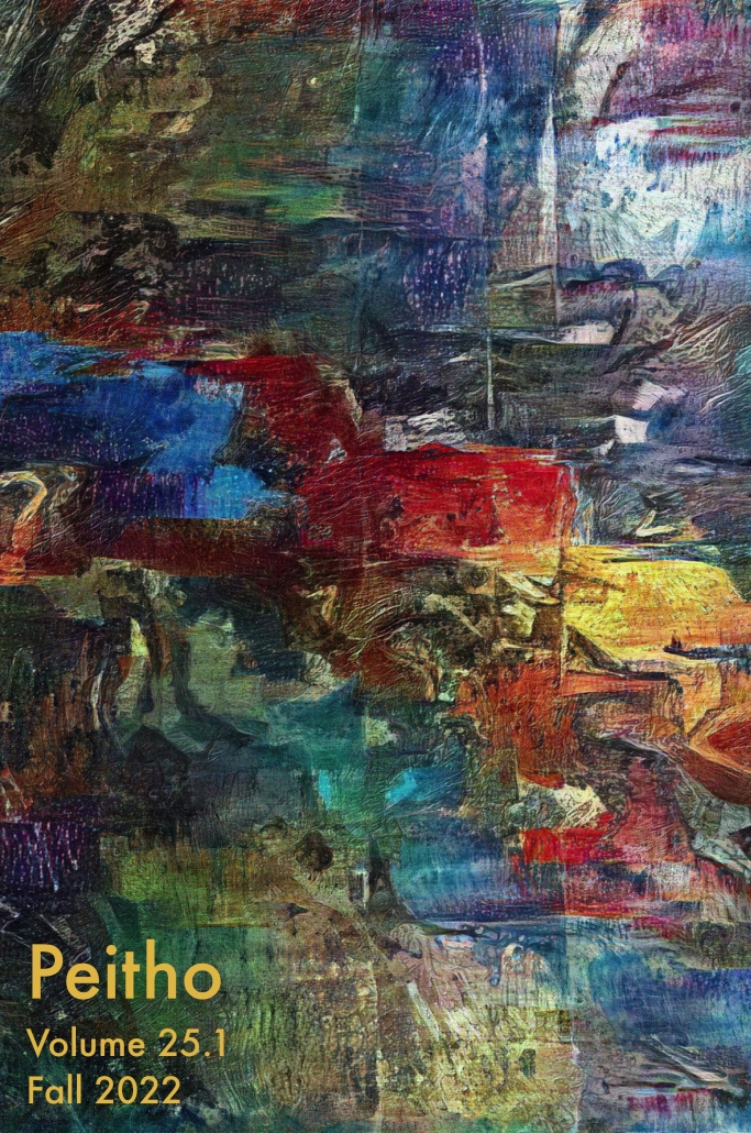 Cover Art: Image description: an abstract painting of wavy, blurred lines in many muted colors: mostly dark greens and blues, but with some red, yellow, and lighter blue and green. In the lower left corner, in yellow, are the words “Peitho Volume 25.1 Fall 2022.”