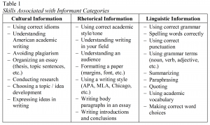 Writers for whom English is a second language (L2) are thought to benefit from tutors who function in an informant role in which they provide cultural, rhetorical, and linguistic information that L2 writers sometimes lack. While this approach is intuitively satisfying because L2 writers may have gaps in their schematic knowledge of English or related rhetoric and culture, researchers have yet to ask students whether they want informant-tutors or to compare student preferences across language backgrounds. In this study, I operationalized three types of information tutors might supply: rhetorical, cultural, and linguistic. Students from across the U.S. (N=200) who had recently attended a writing tutorial completed a survey asking them to rate the relative importance of several sub-skills within each informant category. The students were further categorized as L1, L2, or Generation 1.5 writers based on responses to an extensive demographic section. Results show that all groups felt it was important for tutors to be informants with almost no significant variation across language groups. These findings emphasize that all writers want academic information and suggest that tutors should provide this irrespective of a student’s language background.