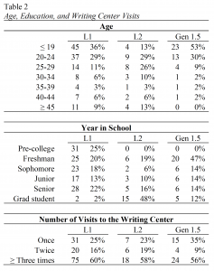 Keywords: L2; Generation 1.5; Rhetorical; Cultural; Linguistic; Informant; Writing Center