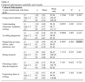 The results of cultural information showed almost no significant differences with the exception of the skill of organizing an essay (see Table 4). Although a post-hoc pairwise comparison failed to significantly distinguish the three groups at the adjusted alpha level, a descriptive analysis of means showed that L1 writers ranked organization slightly more important than L2 and Gen 1.5 writers. This is not to say that Gen 1.5 and L2 writers felt that organization was not important seeing as how the mean scores for all language groups on this item were above 4.5 on a scale where 4 represented important and 5 represented very important. In other words, all participants felt that organization was at least an important topic for tutors to address in a tutorial, but L1 writers felt it was slightly more important than did Gen 1.5 and L2 writers.