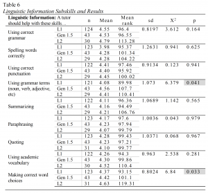 Despite the lack of significant differences, the descriptive mean scores still reveal some insights into writers’ preferences for rhetorical information. In fact, while both L1 and Gen 1.5 writers ranked many rhetorical sub-skills higher than L1 writers, in reality it was Gen 1.5 writers who generally ranked rhetorical sub-skills highest in importance. This may reflect the “ear-learner” status of Gen 1.5 writers described by Reid (1998). Because of their aural acquisition of English, these students may feel the least prepared to engage in American academic writing and rhetoric (Peña, 2014; Thonus, 2003).