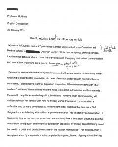 - In paragraph one, I appreciated hearing some specific details about you, such as your military service. This information helps me think about potential influences on your identity, and it shows you are thinking about your audience and what they know and don’t know about you.