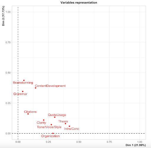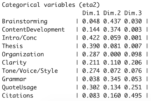 When examining the relative weight of the dependent variables (Figure 4), we established an arbitrarily assigned cutoff point of 0.200, whereby any values below this number were considered not “heavily loaded,” or in other words, not comprising a large portion of that dimension. Our results indicated that Introduction/Conclusion, Thesis statement, and Organization were more “heavily loaded” within Dimension 1 because they had the highest values in that column, meaning that Dimension 1 was most representative of those three variables. In our case, Dimension 2 was heavily loaded with Brainstorming, Content Development, and Grammar – all of which entail the first steps in writing a paper: brainstorming ideas for a thesis statement, main claims, and supporting information. Dimension 3 was heavily loaded with Clarity and Citations, which represent the “finishing touches” in the writing process when writers want to review their assignment to ensure it makes sense and their citations are properly formatted. Dimension 1, described earlier, is associated with Introduction/Conclusion, Thesis statement, and Organization, which compared to Dimensions 2 and 3, would be closer to the middle of the writing process – after brainstorming and developing ideas, and prior to checking for clarity and citations (as most writers ensure that the content of their paper is close to completion prior to making finishing touches to clarity and citation format). As a result, Dimensions 1-3 could be defined as middle-stage writing, early-stage writing, and final-stage writing, respectively. The naming of these dimensions is entirely dependent upon which variables are heavily loaded in each dimension, and this may vary from one writing center to the next. The findings of the Multiple Correspondence Analysis indicated that we successfully “condense” the variables we were analyzing to allow for broader analysis.