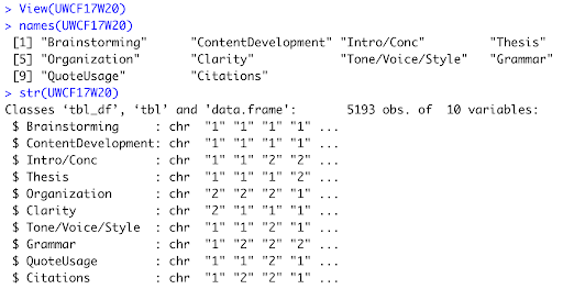 The Names command will display the names of all variables; Str will display the structure of the data set by listing the names of the variables, their classification (continuous scale variables or categorical character variables – in the case of our data set, the latter), sample responses for each variable, and the total sample size of the data set (Figure 2). These commands are necessary to ensure that the data set has been properly imported, that there are no formatting errors, and that the variables have been classified (as continuous/numeric or categorial/characters) properly. A sample output of these commands is seen in Figure 2. Before proceeding, we must consider that last component: the sample size of the data set. Program R sets an arbitrary limit of sample sizes to display, which, if left unchecked has the potential to severely limit the power of the analyses. Researchers can rectify this by setting an upper limit of samples that we want Program R to read and display, which can be accomplished through the options(max.print=???) command. Researchers can either set the upper limit slightly above their sample size, or make it an extraordinary large number (like 1000000) so they do not have to worry about it for the foreseeable future (unless, of course, your writing center reaches one million sessions, in which case, congratulations!). Another caveat to mention here is that numerical values entered in Program R do not need a comma (so the proper syntax for one million would be 1000000, not 1,000,000). The print command will then display your entire data set in the console window.