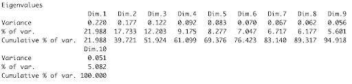 Furthermore, these dimensions also represent the ten variables we initially began with, meaning that D1 would predominantly represent thesis statement and grammar. This would indicate that sessions associated with a higher number on the D1 scale involved students wanting to work on thesis statement and grammar, while those associated with a lower number on the D1 scale were less likely to want to work on thesis statement and grammar. This is then expanded into the number of dimensions being considered in the final analysis.