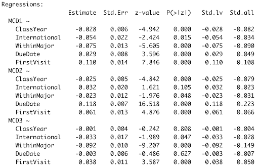 MC1 + MC2 + MC3 ~ ClassYear + WithinMajor + International + DueDate + FirstVisitBinary
