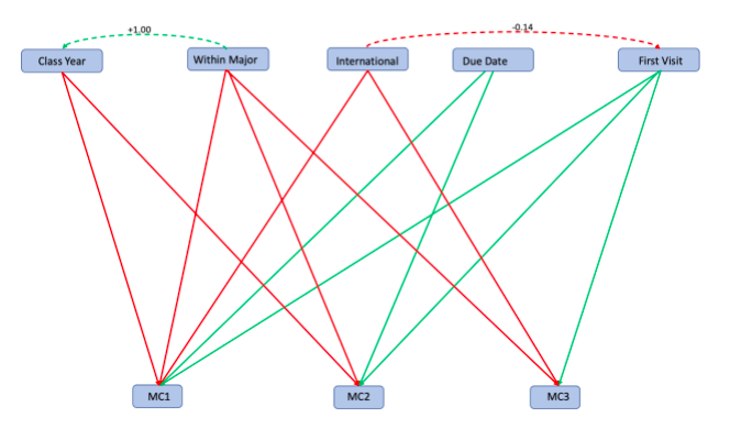 The significant impact of Class Year on MC1 and MC2 suggests that as students progress in their academic careers, their writing concerns shift, and they are less likely to want to work on early-stage and mid-stage writing concerns. This in and of itself is intriguing, but it becomes even more compelling when considering the indirect effect of whether the assignment with which they arrive at the writing center is for a class within their major. The positive correlation between Within Major and Class Year indicates that despite both variables having a negative effect on MC2, Within Major may have a positive indirect effect on MC2 when Class Year is present as a mediator. This expands upon our previous interpretation about the effect of Class Year on MC2 by positing that as students progress in their academic careers, they are less likely to want to work on early stage writing – unless the assignment is for a class within their major, in which case they are more likely to want to work on early-stage writing. The positive effect of Due Date on MC1 and MC2 suggests that the earlier from a due date a student arrives at the writing center, the more likely they will focus on early-stage writing and mid-stage writing, with a preference towards early-stage writing with a greater time between the writing session and assignment due date. This finding supports the sentiment that when working on a writing assignment, it is best to start early and write often, as that will allow writers to receive effective feedback from writing centers if they so choose. The negative impact of International Student status on MC1 suggests that international students are less likely to want to focus on mid-stage writing concerns during a session, as compared to early-stage (brainstorming content development grammar) and final-stage writing (clarity and citations).