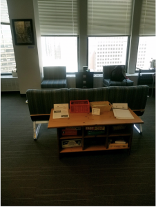 Next to our front desk, we have two chairs and a couch. The inclusion of this furniture adheres to the intention of offering students who visit our center a place where they can sit comfortably. When students check in at the front desk, they are often advised to sit wherever they would like. Sometimes, students will take advantage of the couch or chairs, while other times, students will choose an empty table and ready themselves for their session. This lounge area is not off limits as a place to conduct a tutoring session; however, utilizing this area in this way is a rare occurrence. As it stands, this space reads as nothing more than a waiting area.