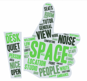 Students were then asked to evaluate how welcoming the Writing Studio space is. We found that many students enjoyed the view from our studio, which has many windows and, since it is on the 24th floor of a central building, provides a great view of downtown Atlanta. Therefore, the view may also contribute to descriptions of the studio “space” as “open,” “natural,” and having “low” lights.