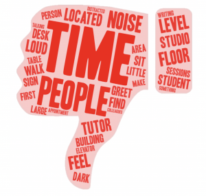 Many students also mentioned that they were intimidated by the Writing Studio’s location in a large building that also houses academic advising offices, which, as one student noted, makes approaching the center feel “pretty serious.” Finally, noise level was a complaint among students who visited when the center was loud. One student described the noise level in the Writing Studio as “unbelievable.” Students who described the noise level as unwelcoming mentioned that it distracted them from their tutoring session or the work they were doing.