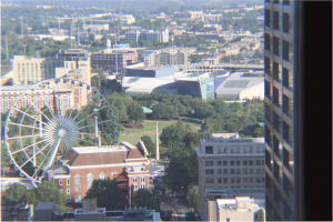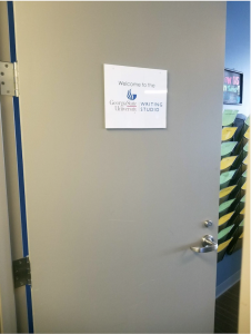 In 2014, Georgia State’s Writing Studio—which operates within the English Department—joined several other departments in relocating to the former “Suntrust building.” Located at 25 Park Place in downtown Atlanta, Georgia, this building served as both a bank location and corporate offices for Suntrust Bank. Despite having some incredible views of downtown from our occupancy on the 24th floor, a residual corporate feel still permeates our space. Consider our door, for instance: solid, gray, and with no windows, the door that serves as the initial impression of our writing center looks exactly like every other door our students have encountered in the building. To counter this uniform characteristic and to help students find our center, we have added a sign to the door that welcomes students. Additionally, we choose to keep the door open, which actually creates a different problem. Surrounded by offices in a setting where voices carry, our writing center has received a fair share of noise complaints. However, closing our door doesn’t seem to be a viable option, since a closed door reads as uninviting, especially a door without windows.