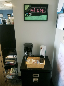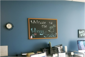 Although we are unable to control the corporate feel and design of our space, we have attempted to make our space as welcoming as possible. Upon entering the writing center, and immediately to the right, we have placed our coffee/tea station, above which is an additional welcome sign. Around the corner from the coffee station, a collection of communal mugs—most of which were donated by former and current tutors—lines a supply cabinet. Additionally, although not in immediate view of students entering the center, our official “Welcome to the Writing Studio” sign hangs on the closest and most logical wall near the front desk.