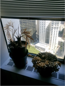 Hidden in the back corner, these plants became even more neglected and forgotten about. What is more unfortunate, however, is that this plant graveyard remained in view of one of the tables used for tutoring, putting the dead plants on display for all those who had a session in the back of the room. We feel it is important to note, however, that during the production of this article, these plants have since been thrown away and replaced with succulent terrariums.