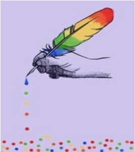 She began by searching for literary quotations from female writers and writers of color, such as 2014 Nobel Peace Prize recipient, Malala Yousafzai, the Pakistani girl shot in October 2009 by Taliban insurgents for championing women’s education (see Figure 1), and 1993 Nobel Peace Prize winner, Nelson Mandela, who spent nearly 30 years in prison for his efforts to end apartheid in South Africa. Slowly, more faces and quotes followed, including authors such as Oscar Wilde, Alison Bechdel, and Leslie Fineberg. However, Leia was aware that some of the students, especially incoming freshmen, might not recognize Wilde, Bechdel, or Fineberg as queer authors. Therefore, she began exploring the possibility of displaying rainbow-colored writing instruments, such as a quill (see Figure 2), stacks of books, and ink overflowing from an inkpot. As her intention was to attempt to make every writer feel welcomed, Leia also made certain to represent the white, hetero, cis-gendered population as well, including quotes from writers such as Stephen King and Tom Clancy. While Leia is happy to report positive reactions from both student writers and fellow consultants to the changes she has introduced, she realizes that the job of highlighting marginalized writers will continue to be a work-in-progress.