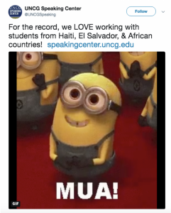@UNCGSpeaking. (2018, January 12). For the record, we LOVE working with students from Haiti, El Salvador, & African countries! Message posted to http://twitter.com/ UNCG Speaking/status/951806229340393472