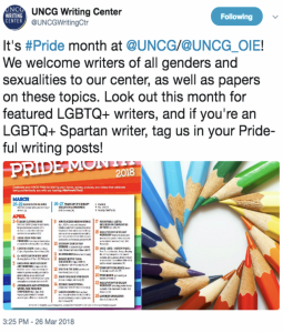 @UNCGWritingCtr. (2018, March 26). We welcome writers of all genders and sexualities to our center, as well as papers on these topics. Look out this month for featured lgbtq+ writers, and if you’re an lgbtq+ spartan writer, tag us in your pride-ful writing posts! Message posted to https://twitter.com/UNCGWritingCtr/status/978367369025347586